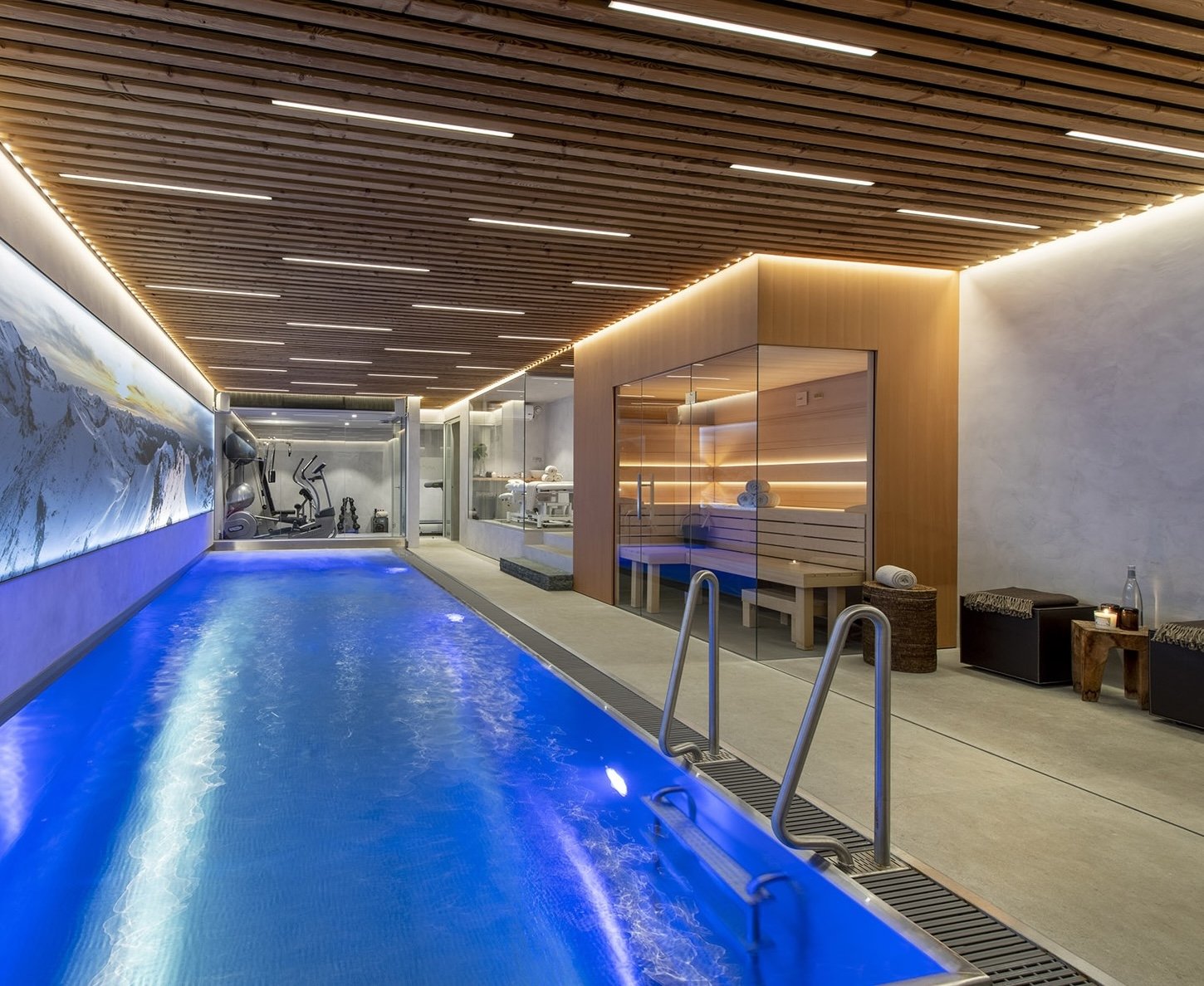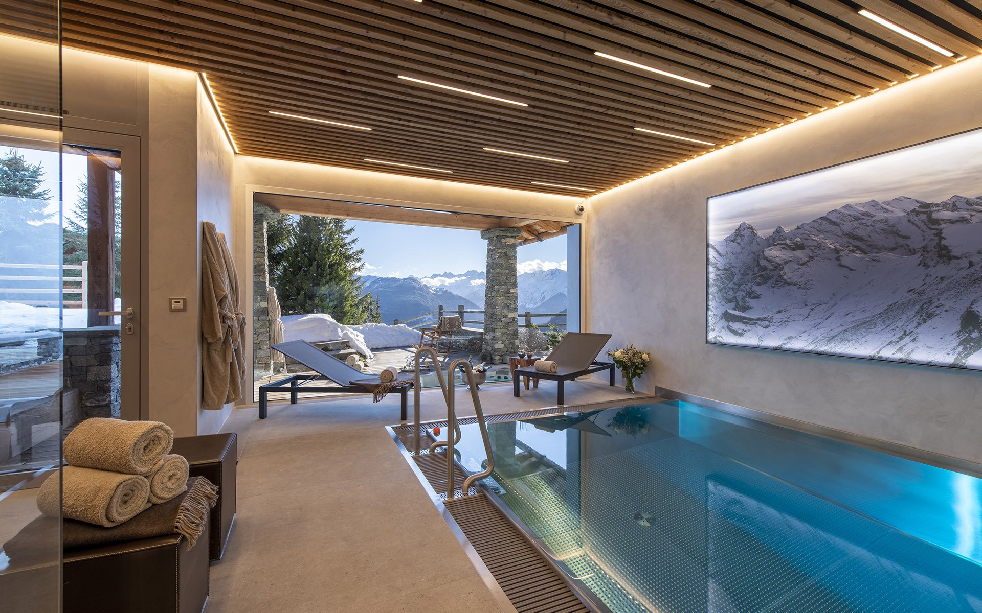 The full sized ‘window wall’ at the end of the pool allows for a landscape view of the terrace, garden, and mountains beyond. In the evening, the underwater lights further enhance the relaxed, opulent feeling of the spa.